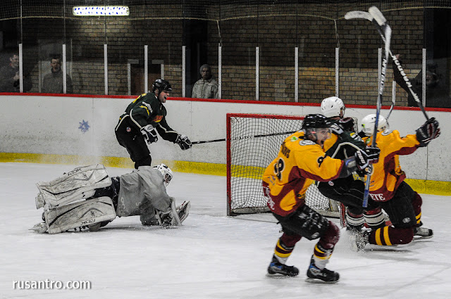 Otrais puslaiks aizsākās ar pavisam nepatīkamu notikumu. Laukuma vidusdaļā ripa noslīd no Arnolda Jaunzema nūjas lāpstiņas un aizslīd tieši pie pretinieka uzbrucēja, kurš veiksmīgi to piespēlē savam partnerim, kurš panāk jau graujošo rezultātu otrajā puslaika minūtē – 1:3.